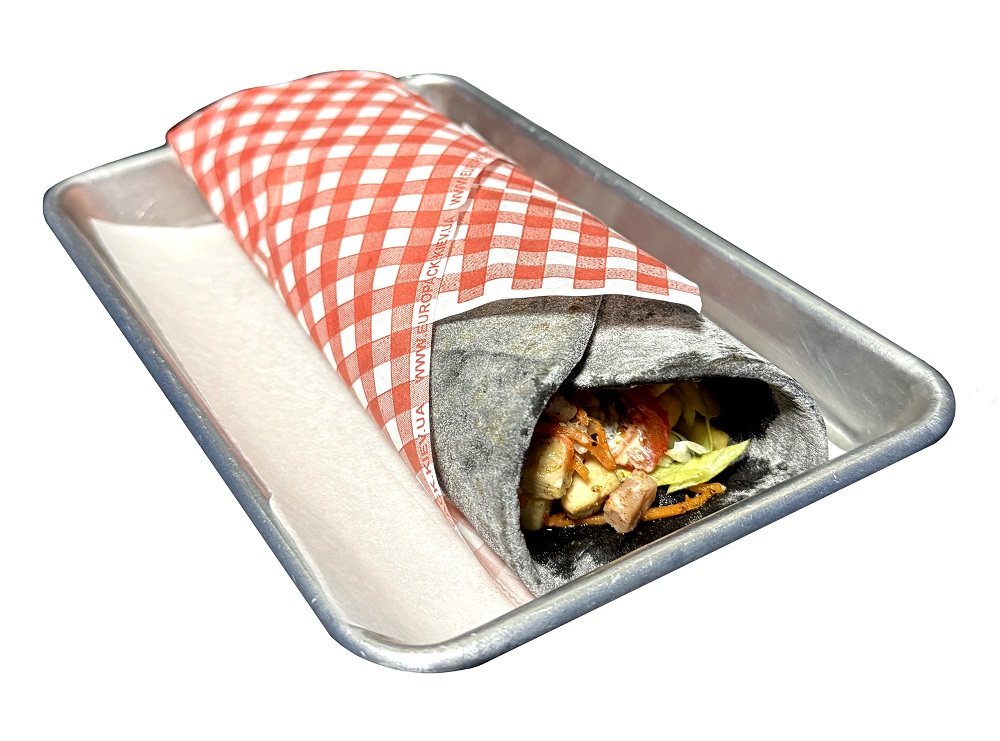 курка BBQ, сир Дуплет, бекон, картопля фрі, сливочно-часниковий соус, fresh салат, морква по-корейські, маринований огірок з перцем халапеньо